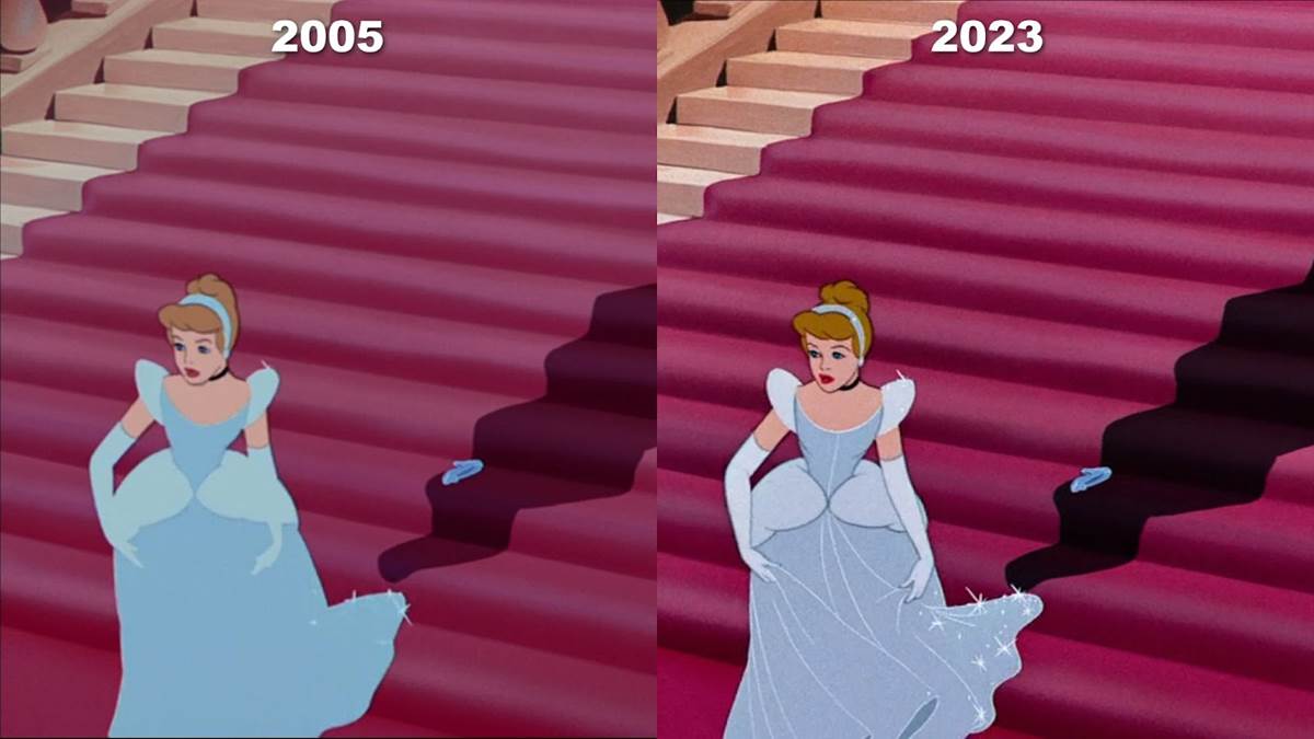The 2005 restoration that has been in use ever since was criticized for a number of reasons. Chief among them, it relied heavily on automatic Digital Noise Reduction (DNR) techniques that obliterated film grain, scrubbing away animation details in the process. Frame-by-frame comparisons with previous laserdisc releases displayed the extent of the issues, with the film literally losing some of its magic by way of the magic dust created by the Fairy Godmother. In other words, Walt Disney’s favorite animation sequence of his studio’s history (Cinderella’s dress transformation) had been scrubbed of some of its luster. In addition, brightness and contrast were dialed way up, with unfaithful colors to the filmmaker's original intent.