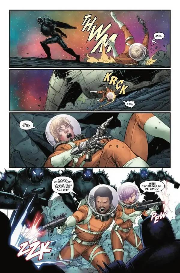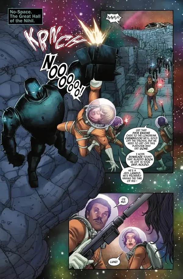 This issue, of course, starts where the previous cliffhanger left off– with Luke Skywalker literally being dangled off a cliff on the platform known as the Great Hall in the uncharted area of the galaxy called No-Space. Luke, Lando, Calrissian, Amilyn Holdo, and Chewbacca struggle in their battle against a horde of kill-droids, until our would-be Jedi hero finds access to the Force once again and sends the murderous droids off the platform into the void of space. He retrieves the Jedi text he was so worried about last month then collapses, waking up sometime later in the Kezarat Colony, where he and his friends bring the good news to Captain Blythe– in addition to eliminating the kill-droids, they managed to retrieve the Nihil Path engine. This begs the question of how many members of the colony will be leaving with our rebel protagonists, but first Lando and Princess Leia have some rather bad news to break about the sorry state of the outside galaxy (namely the existence of the Empire and the Galactic Civil War). Eventually the choice is made for some of the colonists to stay and make a new home on the newly safe Great Hall, while others will return with the rebels. Meanwhile the budding relationship between Lando and Holdo continues to percolate, though I think we have a pretty good idea from other Star Wars media that they won’t last forever as a couple.