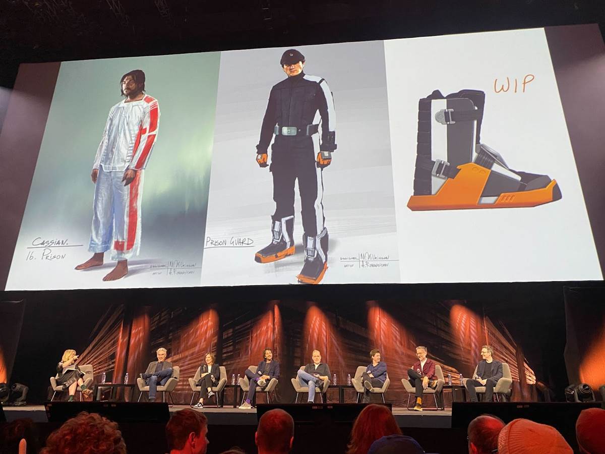 Once the Andor panel began, we heard from showrunner Tony Gilroy, Lucasfilm president Kathleen Kennedy, star and producer Diego Luna, editor John Gilroy, production designer Luke Hull, costume designer Michael Wilkinson, and composer Nicholas Britell about every major aspect of how the series came together on Disney+. Some of the most interesting tidbits were learning that the falling machinery in the factory sequence on Ferrix were real and not digital VFX, and getting to see a lot of the concept design art for the show’s locations and costumes.