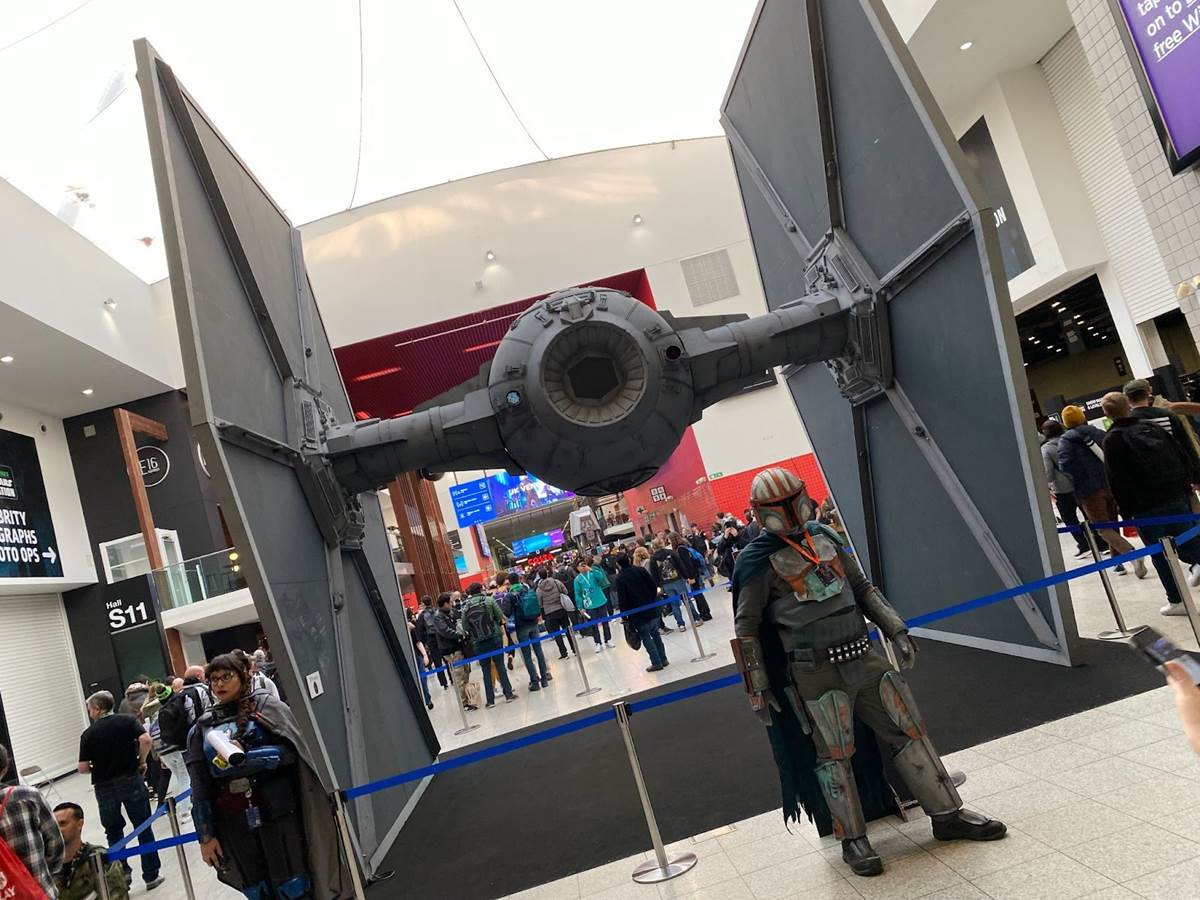 The panel wrapped up with another look at the sizzle reel for season two they had already shown this morning, and then it was time for one more trip through the floor before returning for The Mandalorian screening at 6:00. There’s so much to see on the floor (and the layout of the ExCeL Center combined with the congestion of the crowd made it difficult to see everything in one day) so I’m looking forward to doing more of that in the coming days, but one thing that did jump out at me was Sabine Wren’s painted mural from Star Wars Rebels and Ahsoka, which is available for photo ops.