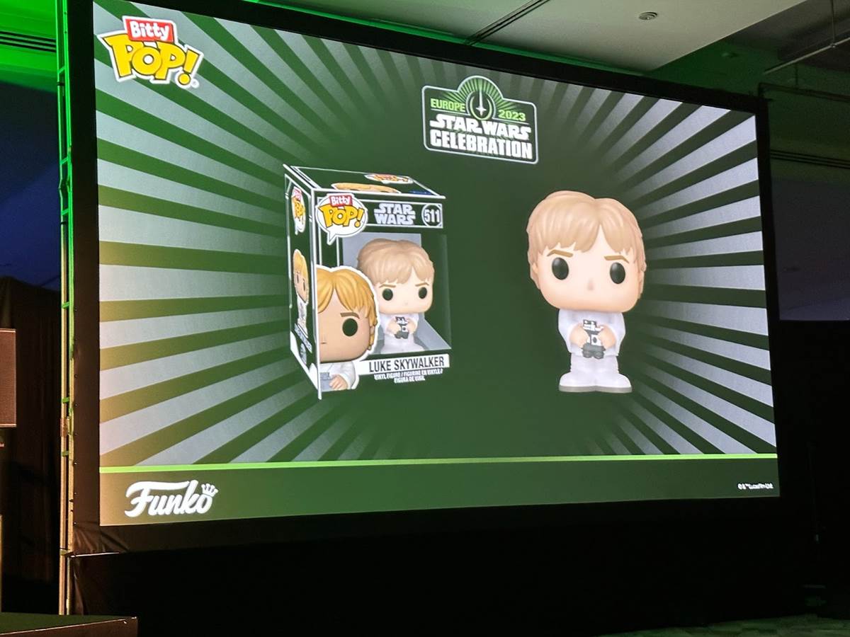 At the core of Funko’s brand are the Pop! vinyl figures and Star Wars has been a top brand for the company since 2011, currently standing at more than 600 releases (including three exclusive to this year’s Star Wars Celebration). While it wasn’t a secret that Star Wars would be the next collection to get the Bitty Pop! treatment (a line of miniature Pop! figures that come in small 4-packs), the big announcement was the entire wave of 16 figures. The collection will honor the film that started it all, A New Hope, and prior to the panel, Funko had teased an image of Luke Skywalker. Funko EMEA digital marketing manager Alex McIntyre enlisted Emily’s help to show the difference in size between a standard-sized Funko Pop!, a keychain version, and the new Bitty Pop! Luke Skywalker.