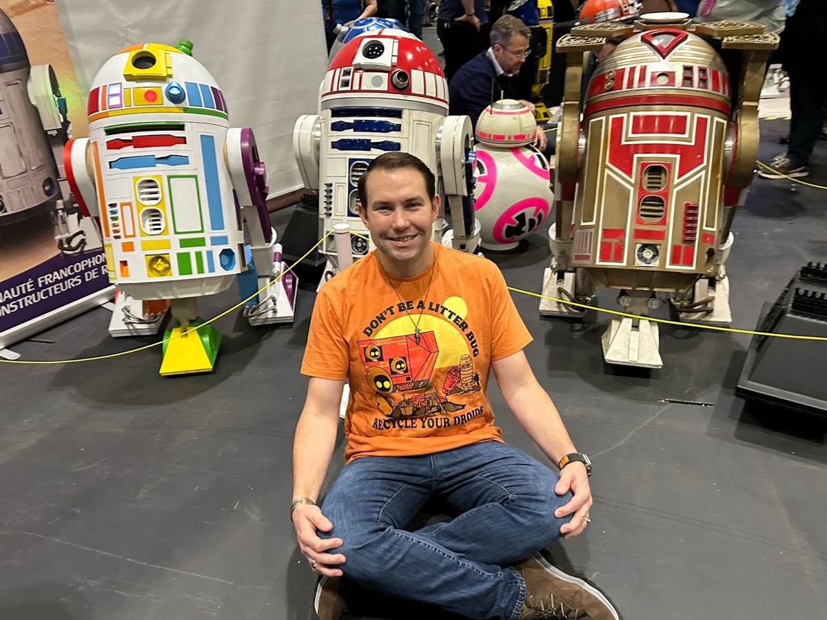I wore the BoxLunch Exclusive Star Wars Jawa Recycle Your Droids T-Shirt while attending Star Wars Celebration at London’s ExCel convention center. The shirt features cute artwork of Jawas not letting any droid parts go to waste, which was perfect for the event since the convention gathers together a diverse group of droid builders. I had a lot of fun posing with these fan-made Astromech units.