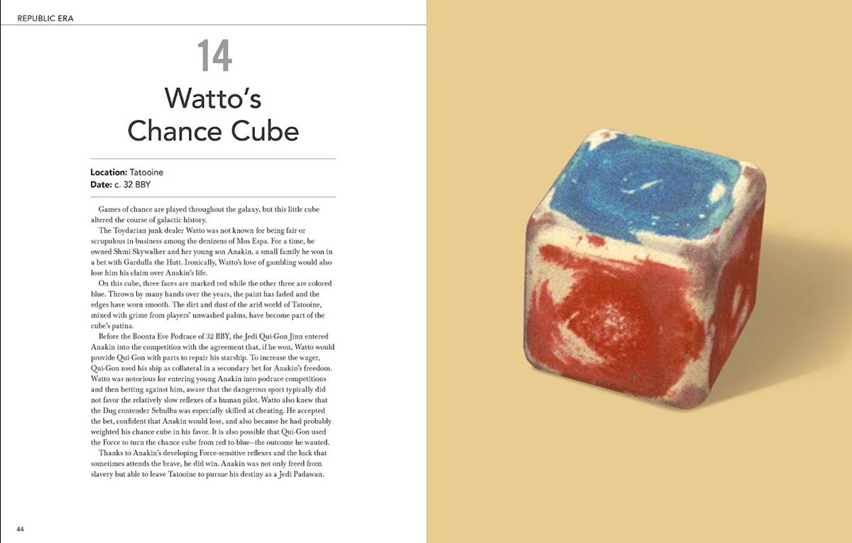 There’s a wealth of information here, though I’m not sure that I would recommend this as an incoming fan’s first Star Wars reference book– that honor might belong to the upcoming Star Wars: Timelines (also from DK and also co-written by Baver), though I haven’t had the chance to go through that one yet. Instead, I would probably suggest Star Wars: 100 Objects as the perfect gift for fans who at the very least have a passing familiarity with the franchise, as to me this book is intended to enhance and expand one’s preexisting knowledge of these objects, as opposed to introducing them. As a side note, being a longtime fan, I’m very thankful that Lucasfilm seems to have officially returned to the BBY / ABY (before / after the Battle of Yavin) dating system, because other current-canon reference guides have invented different scales that only made the bigger picture more confusing. And on the whole, I can absolutely see 100 Objects becoming a must-own for anyone looking to broaden their proficiency in the ins and outs of the items– some very familiar, and some quite obscure– that have made Star Wars tick through four and a half decades’ worth of storytelling.