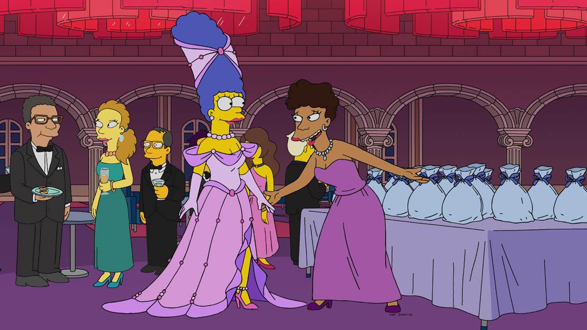 This leads poor, stupid Homer to literally crawl into that space to retrieve the ring, but finding a “stink" of skunks living there instead– among other horrible things like a dead handyman from years past. Homer does manage to locate the ring, but in the process he gets sprayed by the skunks, so his wife Marge (Julie Kavner) has to employ a tried-and-true trick of hers to get the smell off his clothes. She pours a combination of ingredients into a pillowcase and then inserts the shirt and pants, shaking the mixtures until the clothes come out looking and smelling like new– as their son Bart (Nancy Cartwright) observes, she managed to get rid of both the skunk smell and the Homer smell. This gives the Simpson daughter Lisa (Yeardley Smith) a bright idea: why not distribute Marge’s miracle cleaning solution to the unhoused for free to help them get back on their feet. That process goes so well that the Rich Texan (also Castellaneta) donates $100 to their cause, which forces the mother-daughter pair to form a legitimate charity, which Marge insists they name the Lisa M. Simpson foundation in honor of the girl whose idea it was in the first place. This all goes smashingly until Bernice Hibbert (Dawnn Lewis) introduces Marge to the world of high-society charitable awareness-raising. Things progress to the point that Lisa gets upset with Marge for partnering with some very questionable donors who are only using the charity as an excuse to deduct from their taxes, including the “worst polluter in Springfield" Mr. Burns (Harry Shearer).