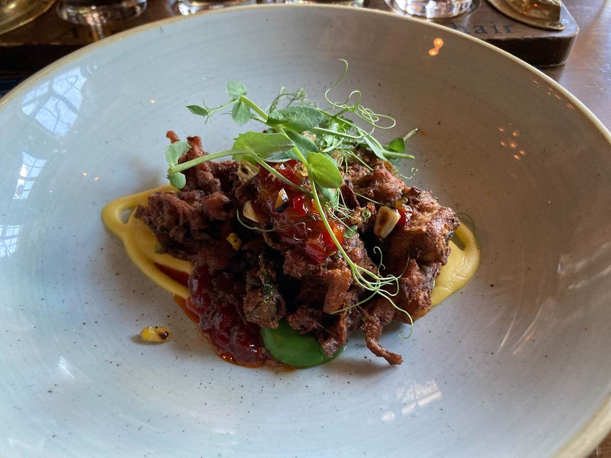 Broccoli, corn & chili fritter, sweetcorn puree, jalapeno & fire roasted bell pepper relish