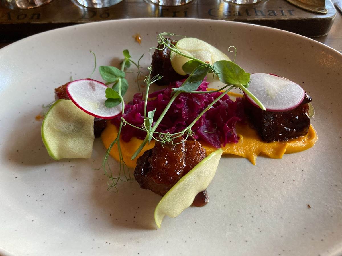 Irish cider glazed spiced pork belly, pickled cabbage slaw, butternut squash and maple puree