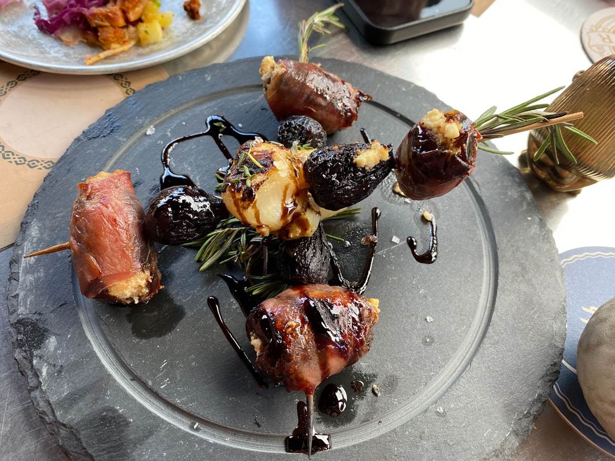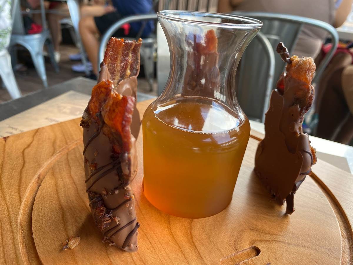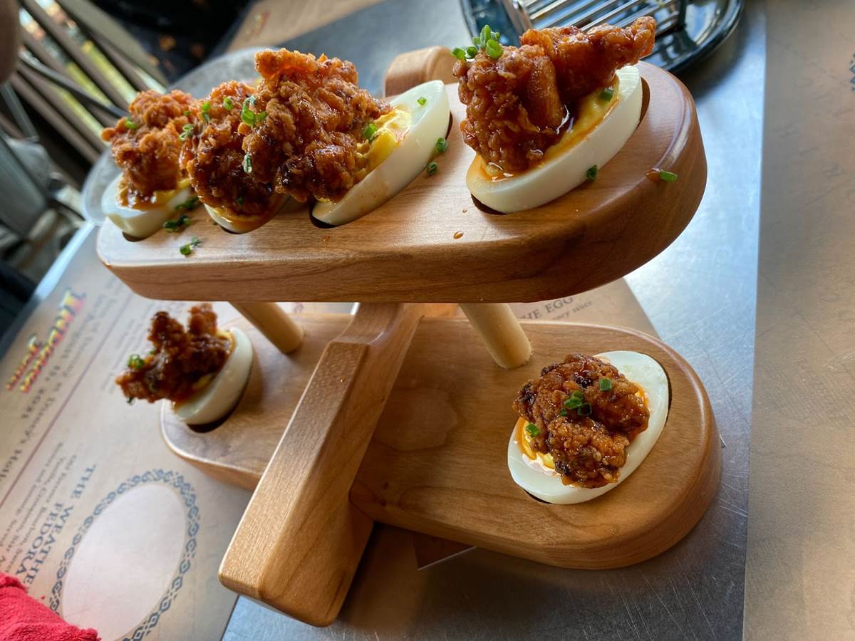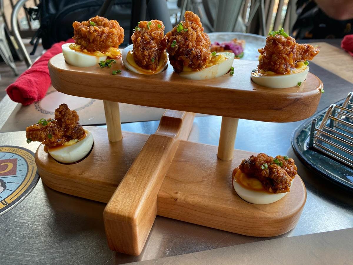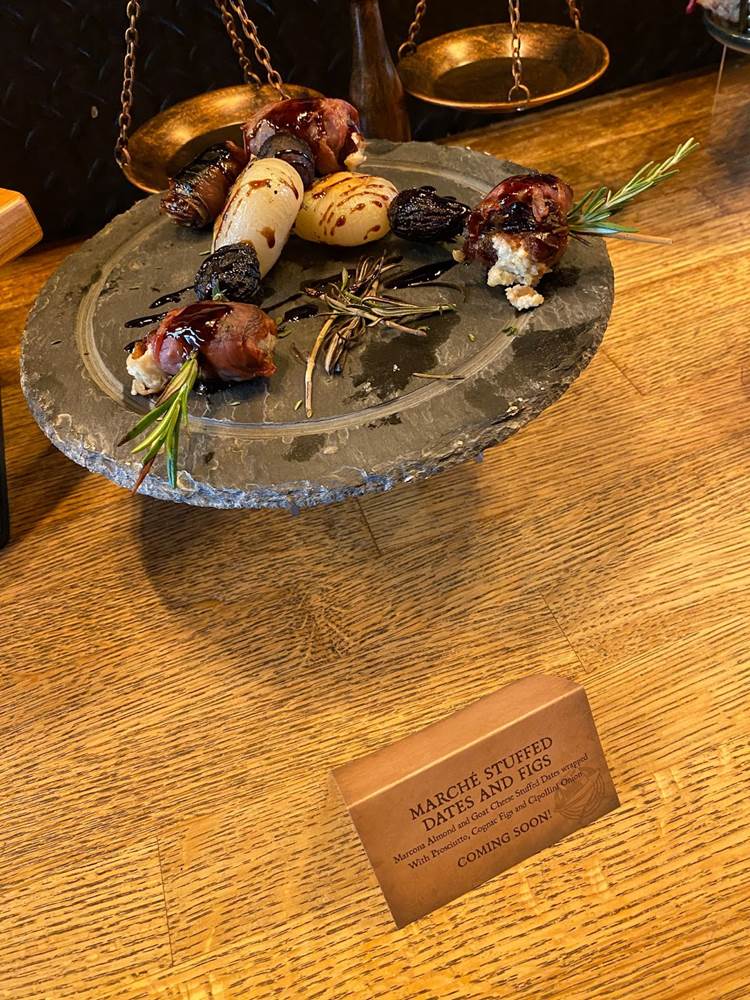 During our visit to Jock Lindsey’s Hangar Bar today, we got to try out some of the new menu items, which are all delicious and inventive (some of them are even gluten-free as well, which was perfect for me). Check out the up-close photos of the Tacos Al Pastor, the Chicken On the Egg, the Giant Bacon for All Mankind, and the Marche Stuffed Dates and Figs below.