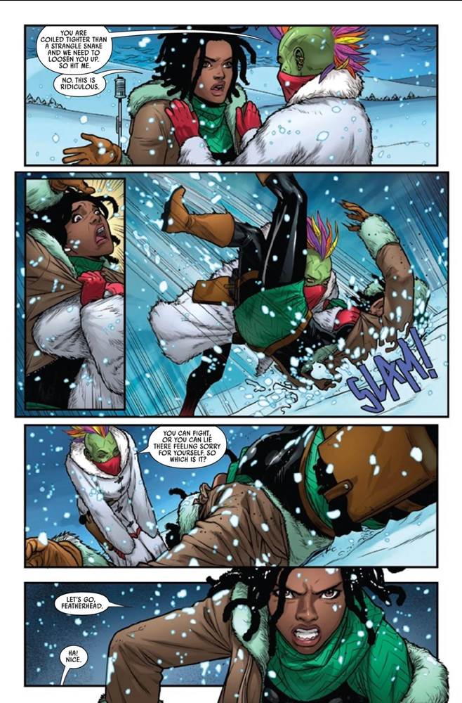 Sana Starros #4 began with the title character working with her Aunt Mevera and their adopted cousin Deva Lompop to race to the rescue of other members of their family aboard an Imperial capital ship. Sana’s cousin Aryssha is preparing to give birth to her babies, who have been fathered by a not-so-nice Imperial officer, while Sana’s brother Phel has also allied himself with the Empire– we get the backstory as to how that happened in this issue, as well. On the snowy planet of Hynestia, Deva challenges Sana to let some of her aggression out in a sparring match, as Mevera collects supplies for their plan to infiltrate the enemy vessel. But before that mission is enacted, they also need to rescue Sana’s grandmother from a bounty hunter– a task that soon turns out to be more connected to their larger goal than they’d realized. Then, in issue #5, Mevera and Grammy help Aryssha get ready for her big moment while covert operatives (including a surprise appearance by a certain pirate named Hondo Ohnaka) help to deactivate the Imperial ship and rescue the Starroses aboard.