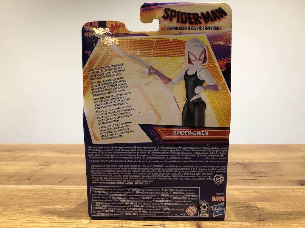 One trend I’ve recently seen across several Hasbro toy lines is the move away from plastic packaging. This figure is attached to a cardboard card with a boxy bottom so that it can stand on its own or hang from a display rack. She’s secured to the box with paper twist ties instead of plastic ties or bands. The packaging also features the hexagon Spider-Verse portal behind her and Spider-Man 2099 and Miles Morales join her as they swing through the city.