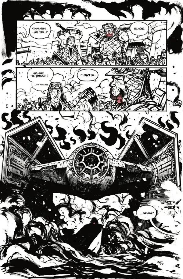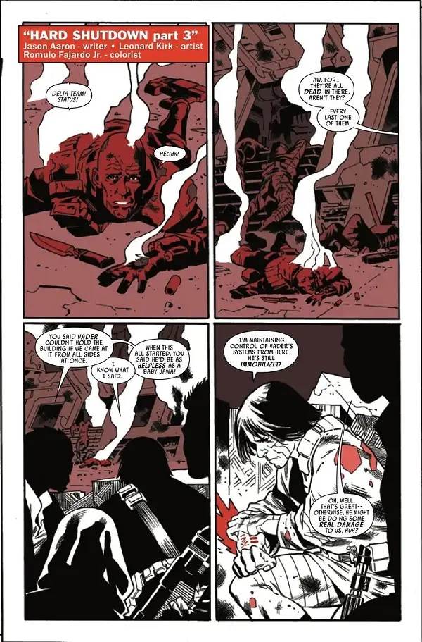 Darth Vader - Black, White & Red #3 opens with a continuation of the main “Hard Shutdown" story written by Jason Aaron and illustrated by Leonard Kirk with colorist Romulo Fajardo Jr. This tale sees Vader having been captured by mercenaries seeking revenge on the Dark Lord, but we readers know he is far too powerful to allow himself to be bettered by this ragtag group of outlaws. In this chapter, the team attempts to simply blow up the building that contains Vader’s body, which has been immobilized and strapped to an operating table. They even send a starship in, armed to the teeth, but Vader gets the better of it, seizing control of the vessel via use of the Force’s dark side. It’s an awesome demonstration of the Sith’s power, but that’s nothing compared to the destruction we see on display in this month’s second story, entitled “Annihilated," which was written and illustrated by Daniel Warren Johnson of DC’s Wonder Woman: Dead Earth. This story follows an Imperial strike force as it tracks a rebel ship to a hidden base, and then unleashes Darth Vader in his TIE Advanced starfighter to take out pretty much the entire fleet stationed on a Hoth-like planet.