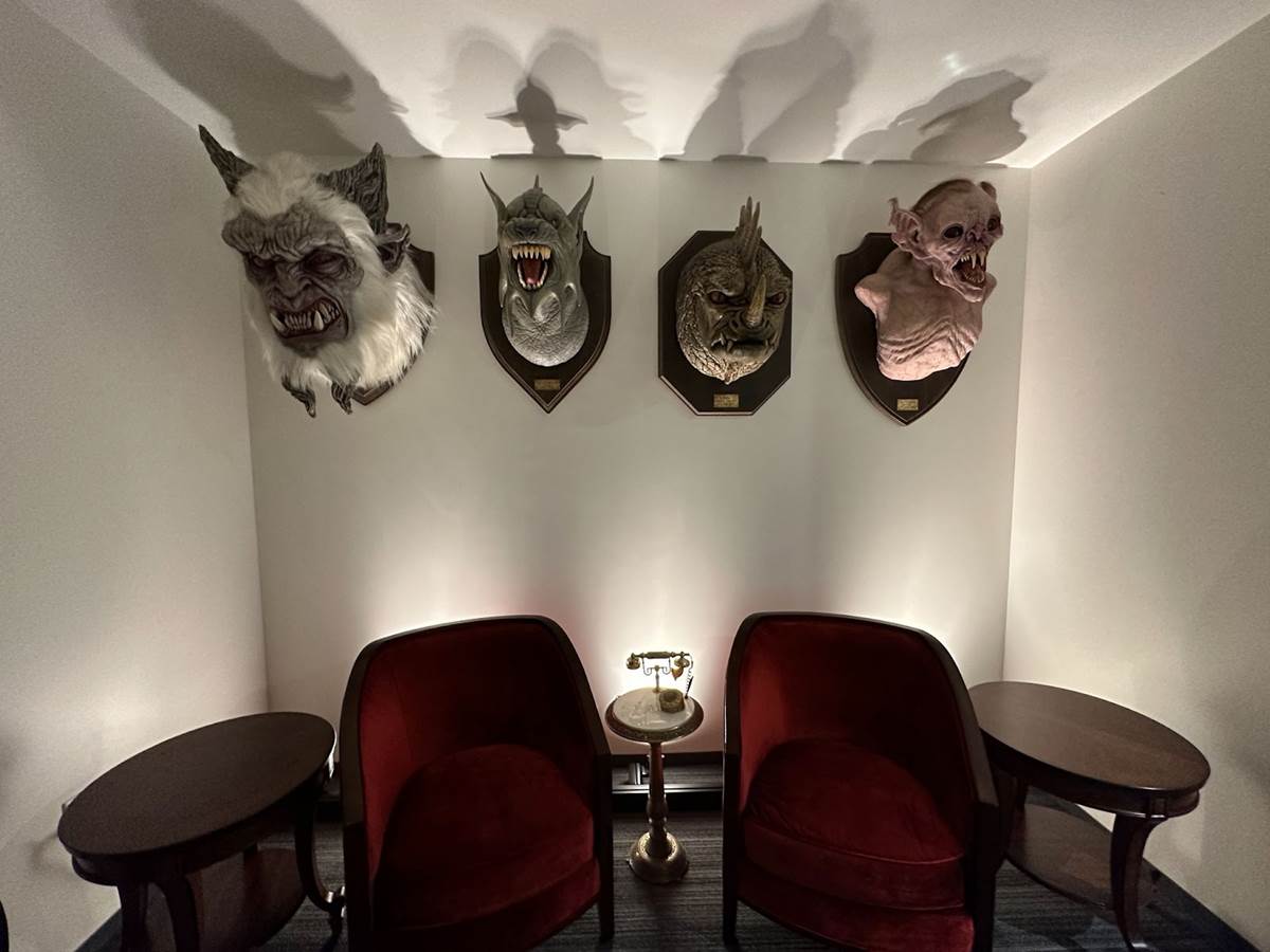 Busts of creatures from Werewolf by Night decorate this corner of the office.