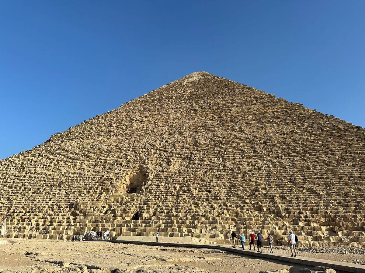 We were allowed to go inside (no photos allowed) through the robber’s tunnel, which is below the entrance that was originally designed above it. We were warned that it would be a strenuous and claustrophobic climb, all of which was true. Low ceilings meant that most of the climb had to be done bent over, and some flat areas required a duck walk or crawling on hands and knees to get through. We first went to the highest chamber, which once housed the sarcophagus of Pharaoh Khufu. On the way down, we also got to visit the Queen’s Chamber, where Khufu’s wives were likely buried (the pyramids were looted before the founding of Egyptology).