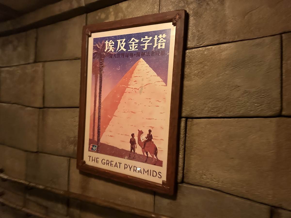 Soarin’ Around the World (aka Soaring: Fantastic Flight at Tokyo DisneySea and Soaring Over the Horizon at Shanghai Disneyland) includes a flyover of the Great Pyramids. At Shanghai Disneyland, the exit to the attraction features posters for the destinations you just soared above, including this one.