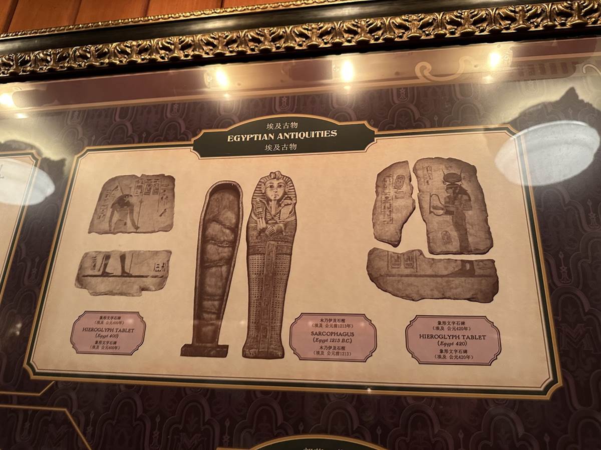 Lord Henry Mystic has an entire room in Mystic Manor at Hong Kong Disneyland devoted to Egyptian Antiquities. The queue offers a preview of the collection.