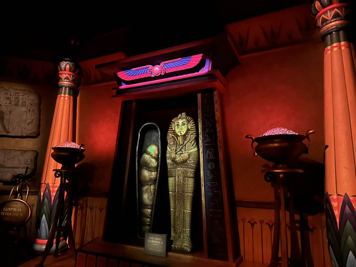 The trackless ride includes a stop in the room of Egyptian Antiquities. With Albert having activated a mysterious music box that makes the manor act in peculiar ways, the room literally brings ancient history to life.