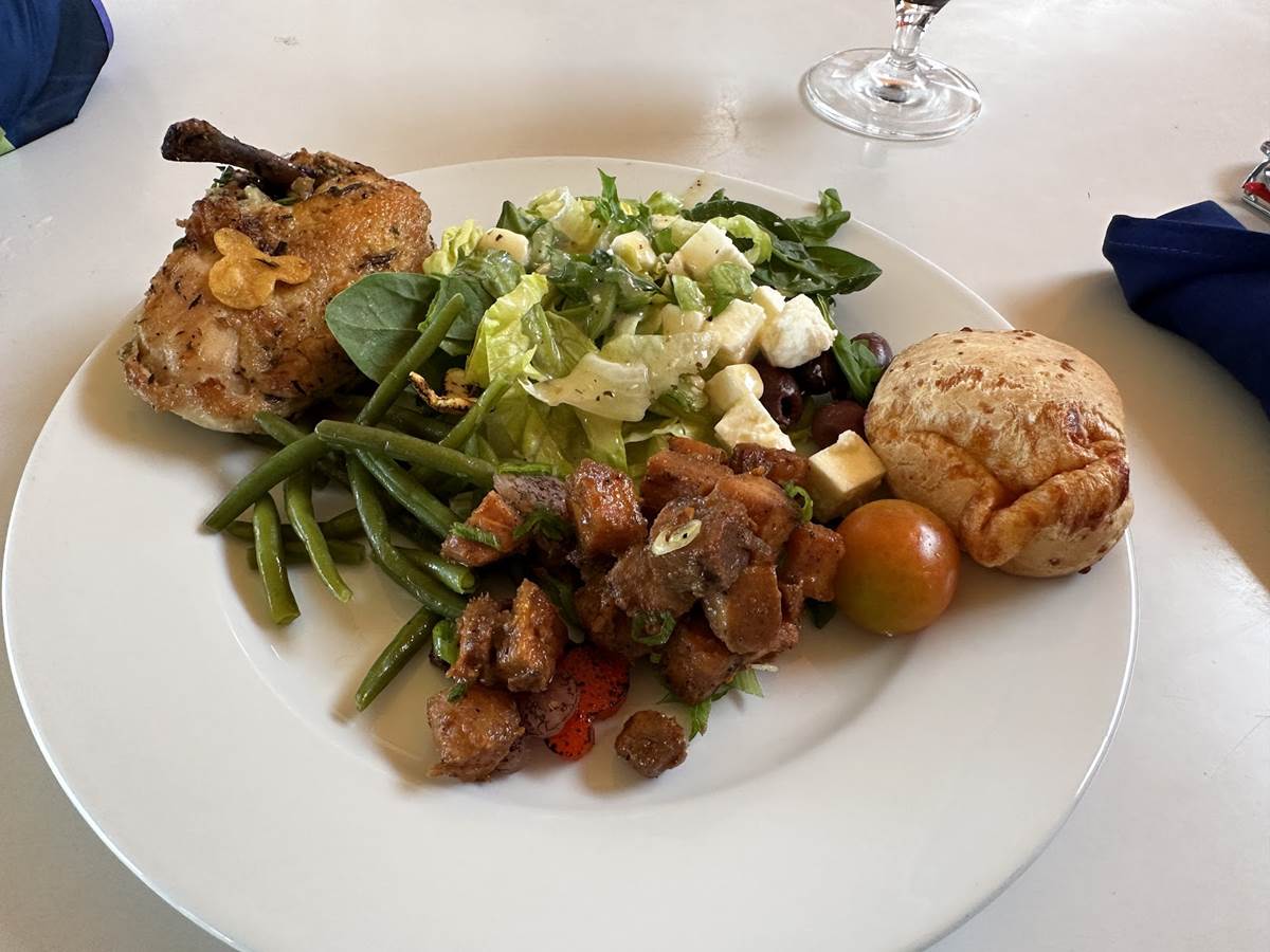 Lunch included chicken, a Greek salad, sweet potato casserole, and cheesy bread rolls. There was also an open bar, in addition to non-alcoholic refreshments.