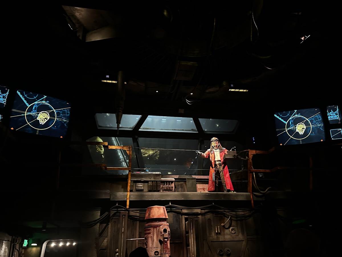 After lunch, our VIP Guides from the previous day were waiting to start our next adventure. Our guide, Shane, drove us to Disney’s Hollywood Studios, where we parked backstage at Star Wars: Galaxy’s Edge for a very special experience. We were taken backstage of Millennium Falcon: Smuggler’s Run to see one of 2 pods for Guests with mobility challenges in action. It allows for a longer load time than the typical rotating pods while still offering the same experience, with the asteroid scene included on all journeys (you only see it on the regular pods if there’s a delay). These pods are on hydraulic lifts and a rolling track that slides them into the screened dome after boarding is complete. After seeing backstage, we got to experience the attraction ourselves.