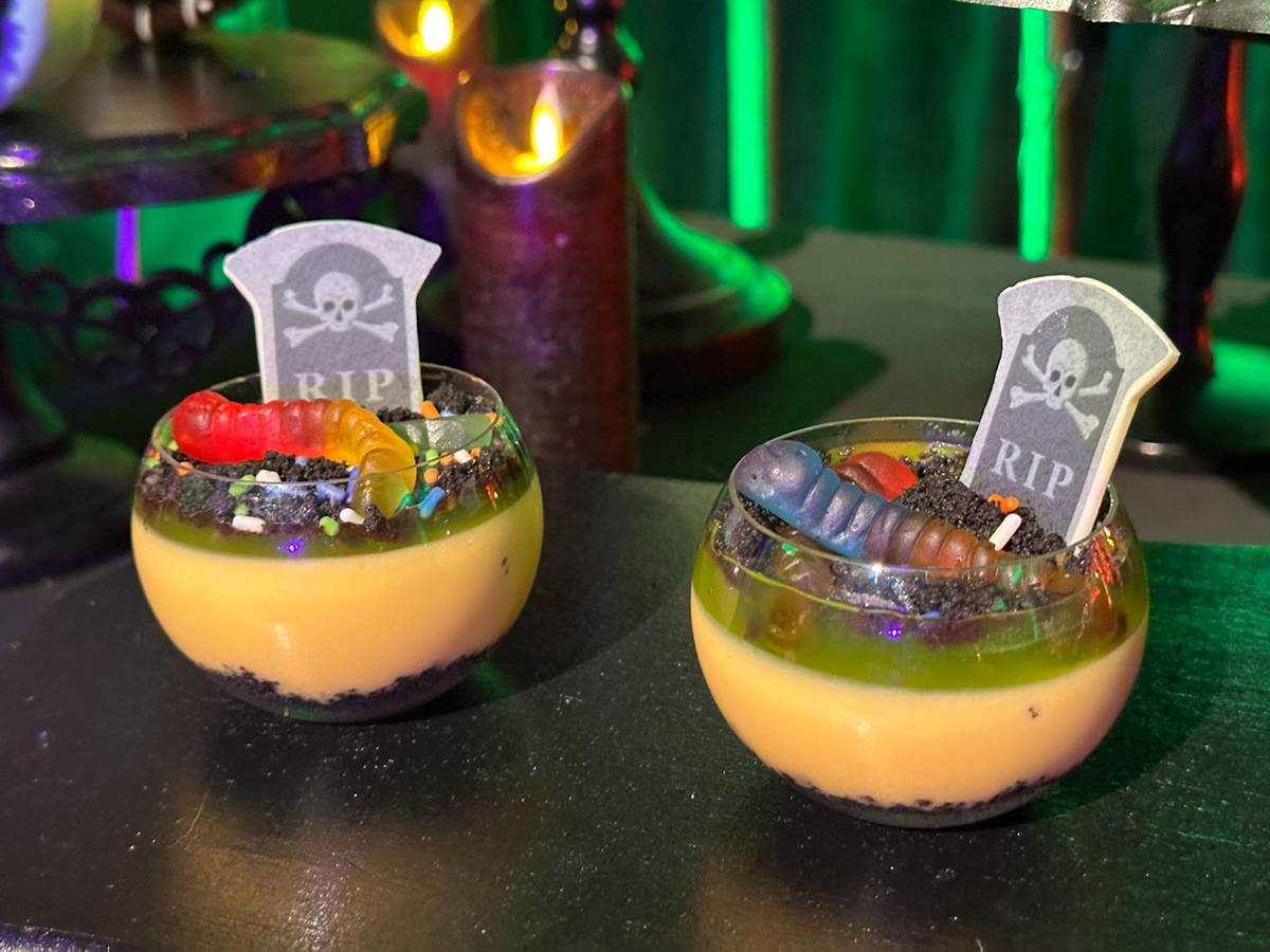 Storybook Treats in Fantasyland is where Guests will find a tropical twist on the classic worms in dirt. The Tropical Graveyard features mango mousse and sour tropical gelatin topped with cookie crumbles, a gummy worm, sprinkles, and a tombstone chocolate piece.