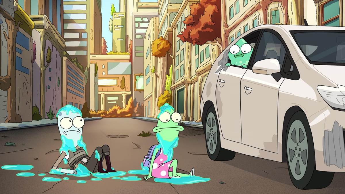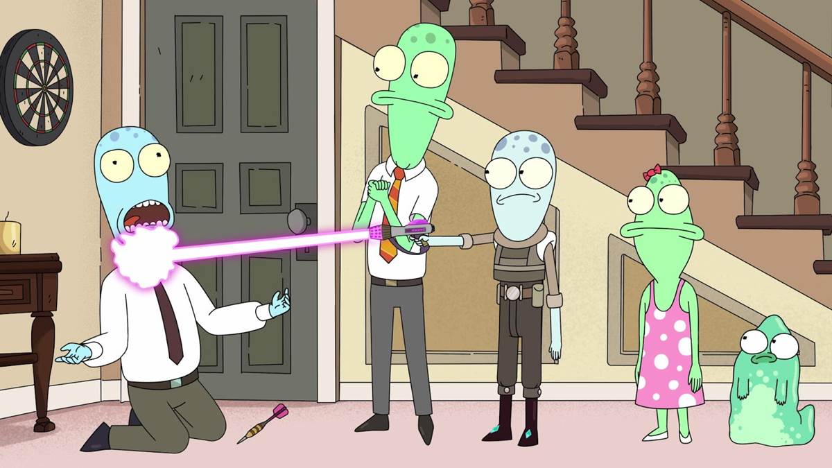 And for right now I would say by and large the answer is ‘yes.’ Naturally it took me a few episodes to get used to Stevens’s voice coming out of Korvo’s mouth instead of Roiland’s, but once that difference settled in I was able to appreciate the show on essentially the same level as I did seasons one through three. This go-round opens with the premise that Korvo and his mate Terry (still voiced by Thomas Middleditch) have gotten boring office jobs at a rake company in order to get them through their humdrum lives and make them seem more normal, but soon they become obsessed with the idea of their boss buying a ping-pong table to improve morale for the staff. This is a pretty funny premise, and an unusually grounded way to ease us into the new status quo of the series, though things take a unmistakably Solar Opposites turn by the end of the episode. Other adventures include a return to the tree-based city that was created by alien technology earlier in the season, an extremely meta trip through the stock-photo universe, and another conflict with the Gooblers. The alien ship’s artificial-intelligence A.I.S.H.A. (yes, still Tiffany Haddish) also finally gets her time to shine, and I particularly enjoyed the one-two punch of the penultimate episode, in which Terry and Korvo accidentally turn themselves invisible, and the very funny season finale, in which the entire alien family begin to transform into humans because they’ve spent too much time on Earth.