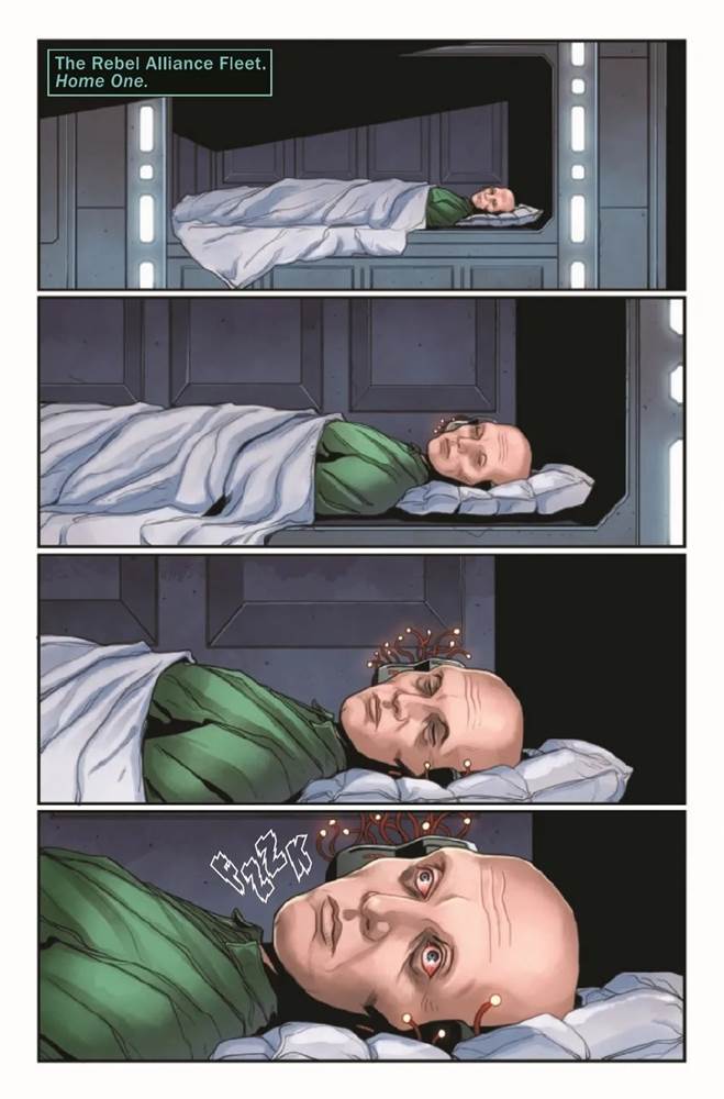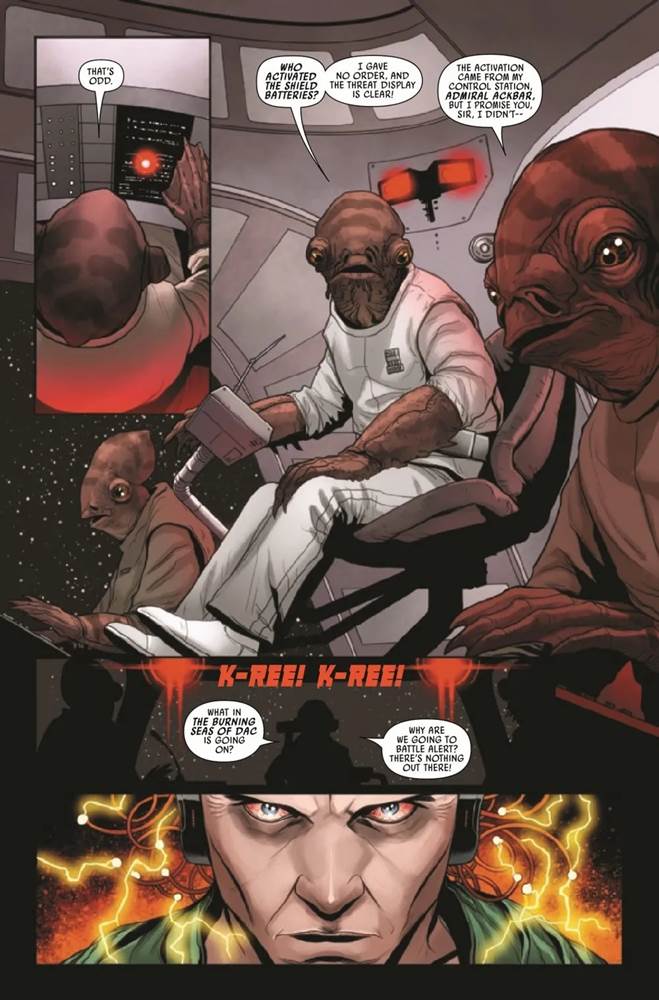 Star Wars #37 begins with Lando Calrissian’s cyborg pal Lobot waking up from his slumber aboard the Rebel Alliance’s Mon Calamari flagship Home One. His cybernetic implants start going haywire and suddenly the ship’s systems are stripped from the controls of Admiral Ackbar and his subordinates. When Lando is awoken by the subsequent alarms, he finds Lobot in a state of hypnosis and must smash the cyborg’s implants to get the ship’s functions to return to normal. One covert meeting with a 2-1B medical droid later, and Lando learns that the implants are reverting back to their old Imperial programming, though for now this is seemingly unrelated to the Scourge’s droid invasion as seen in the pages of Dark Droids #1. So Lando comes up with a plan to return to Jabba’s Palace on Tatooine with Lobot, and have the ancient “Talky" droid (see previous issues of this volume of Star Wars for more on that) repair the cyborg’s implants, hopefully bringing Lobot back to his old personality. Unfortunately this requires Calrissian to mislead some of the Rebel Alliance leaders who have put their trust in him, including Princess Leia Organa, even more than he already has been.