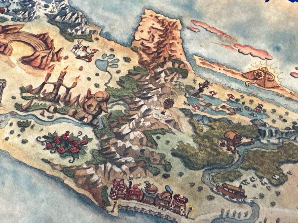 Heading back to mid-island, just before another dividing line of mountains, there’s another Moana reference, with Hei Hei near a hut. Could this be a lounge? Above that, it looks like a teapot and teacup from Alice in Wonderland, possibly a nod to the Wonderland Theater, one of two movie theaters aboard the Disney Wish. Just over the mountain pass is an X-Wing that has landed, implying there will be a Star Wars: Hyperspace Lounge on board. At the southernmost point of the range is the Cave of Wonders from Aladdin. Could this be the theme of the adjacent lounge, the Disney Treasure’s equivalent of Nightingales?