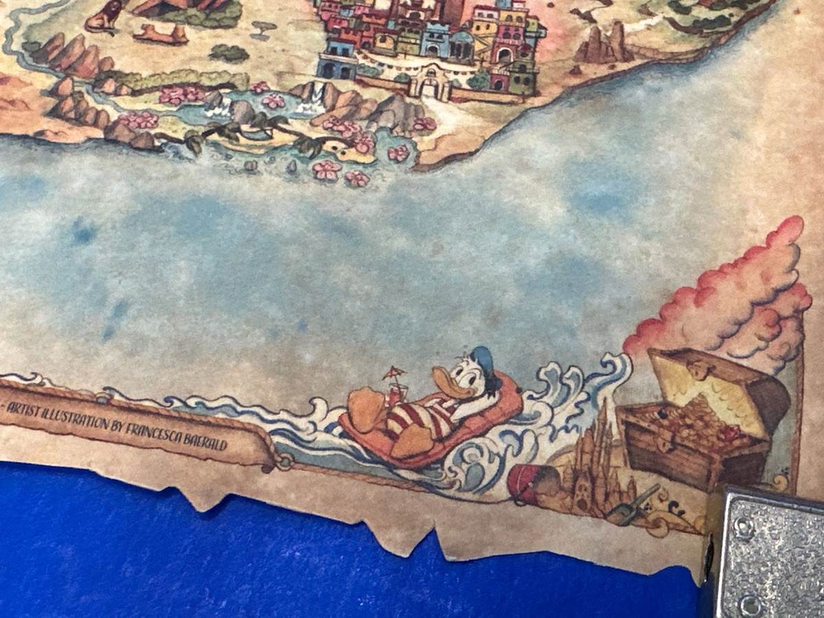 You’ll notice that the map is shaped like a Disney Cruise Line vessel. So far, all we really know is that the ship will be called the Disney Treasure, the characters on the back will be Captain Hook and Peter Pan, and that the atrium contains a statue of Aladdin and Jasmine riding the Magic Carpet. With that as our guide, let’s start exploring from the center. It’s very clear that the Palace of Agrabah symbolizes that central hub of the ship. Above it is Spaceship Earth nestled within a mountain range that could suggest the Matterhorn Bobsleds or Expedition Everest. It’s not that out of the question when you consider that to the left of Agrabah is what appears to be The Jungle Cruise. Above that, you see Goofy playing lifeguard near a pyramid that appears to have a slide coming out of it. If you follow the flow of the river down, you’ll also find what looks like food stands run by Mickey, Minnie, Goofy, Donald, and Daisy. Near there, it looks like there’s a tranquil Mulan-inspired wading pool, plus Rex and Trixie from Toy Story seem to be having a lot of fun near some geysers.