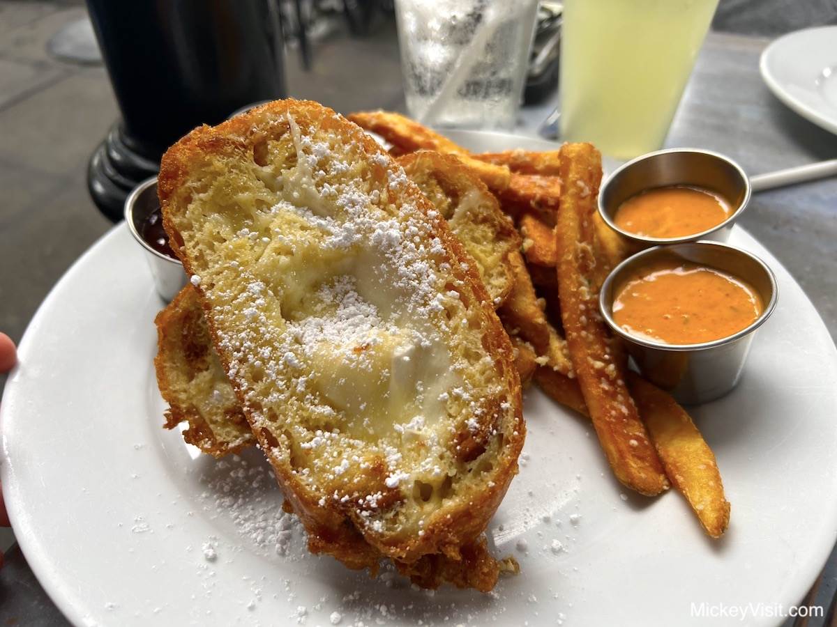 Monte Cristo Sandwich at Cafe Orleans at New Orleans Square. This battered and fried sandwich contains sliced turkey, ham and swiss with seasonal preserves. Alternatively, there’s a triple cheese version with Brie, Swiss and Mozzarella (and no meat). The combination of sweet and salty flavors is divine, and the texture of the sandwich with its crunchy and melty components makes every bite an incredible experience. This is a well-balanced dish and not one to be missed if you are planning on dining at the New Orleans-inspired Cafe Orleans, one of the best Disneyland restaurants. Make sure to secure a reservation before going, as this popular dining location books up in advance!