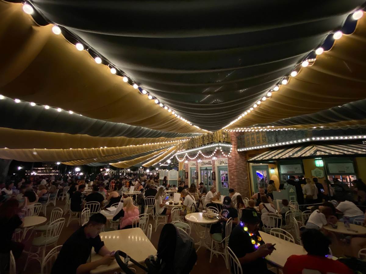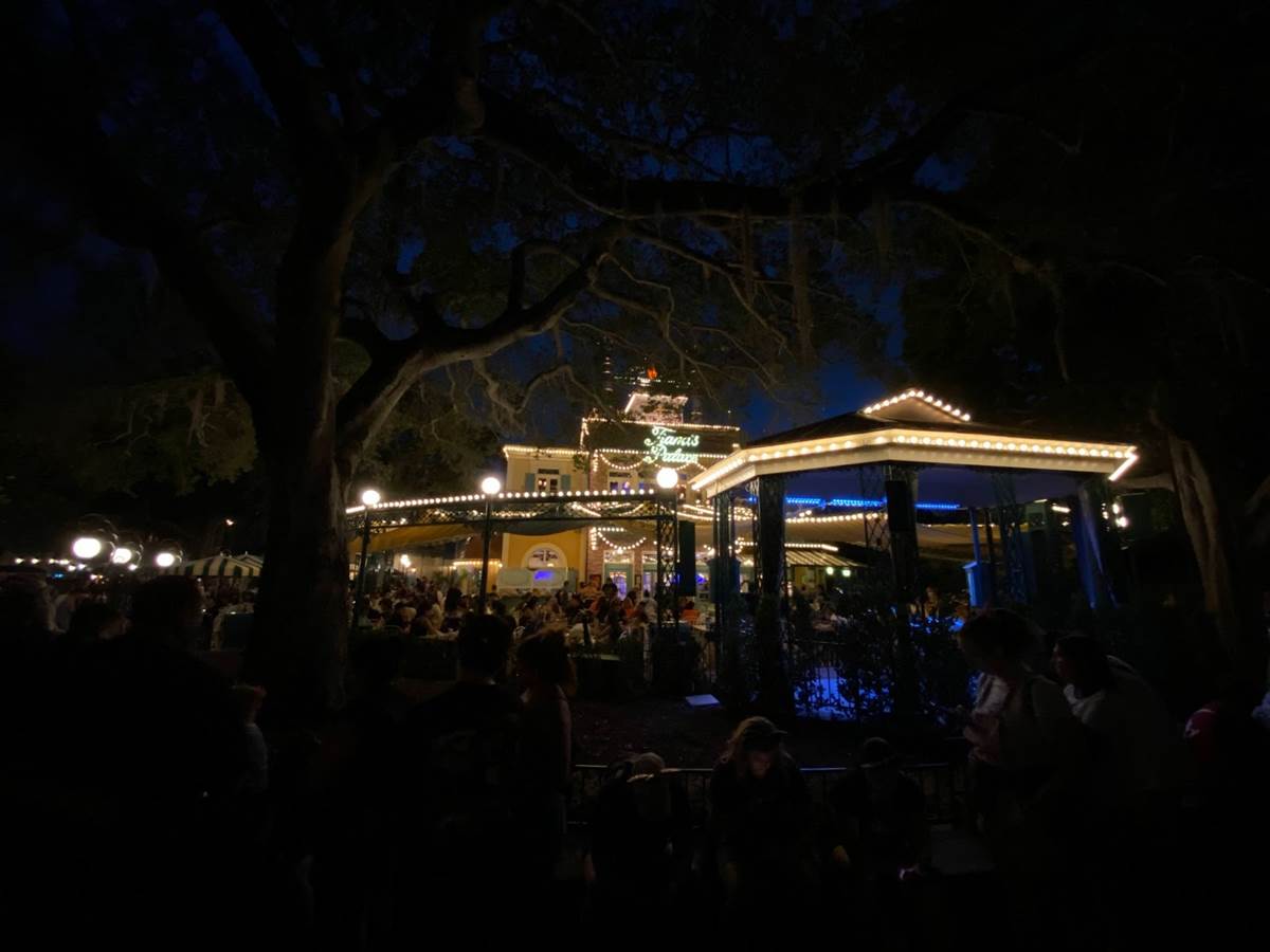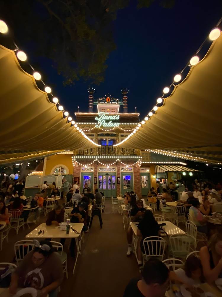 Finally nighttime rolled around and I was able to snap a bunch of photos of Tiana’s Palace in all its lit-up splendor, and it certainly looks great!