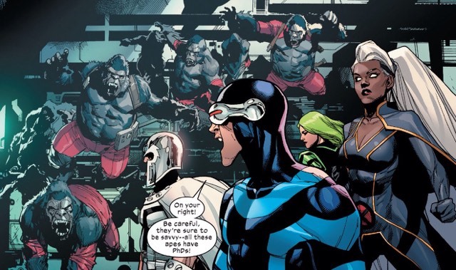 That’s not to say there’s not a fair amount of action though. The issue kicks off with Storm an Cyclops on a mission to rescue a bunch of captive Mutant children from Orchis, an organization made up of brilliant human minds dedicated to protecting the human race from doomsday. There’s plenty of lightning, laser blasts and even a fight with an army of gorillas.