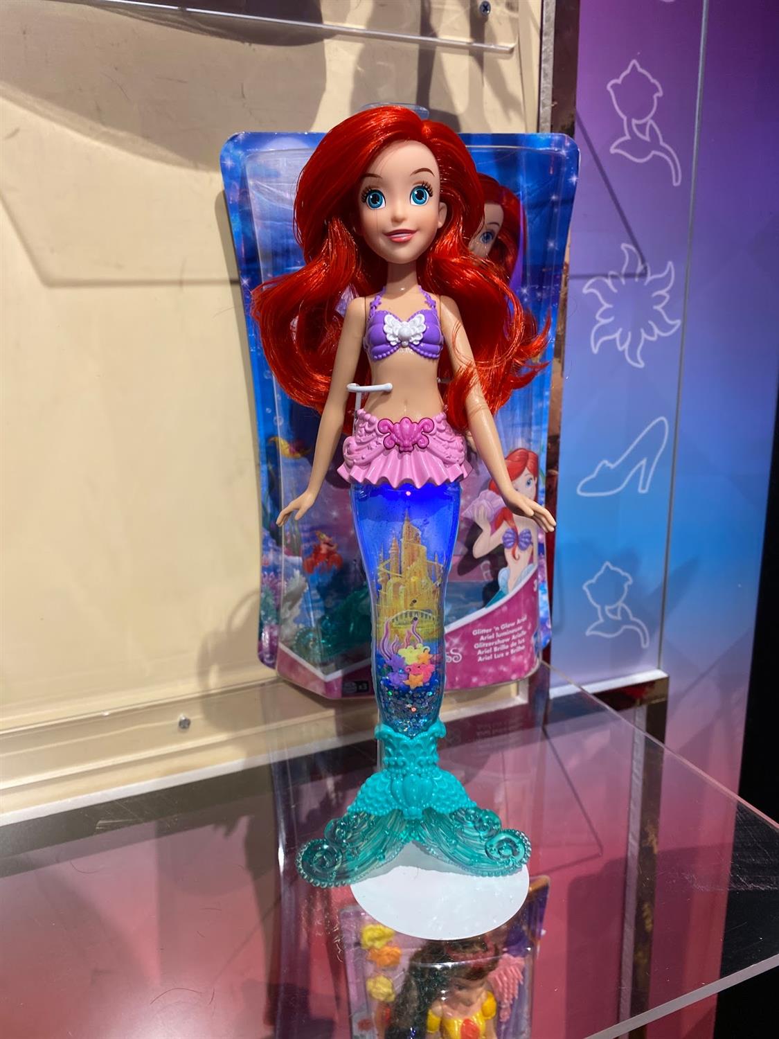 Looking for even more magic? Glitter n’ Glow Ariel has a tail full of glitter water. Press the button on her waist to activate a spectacular light show effect.