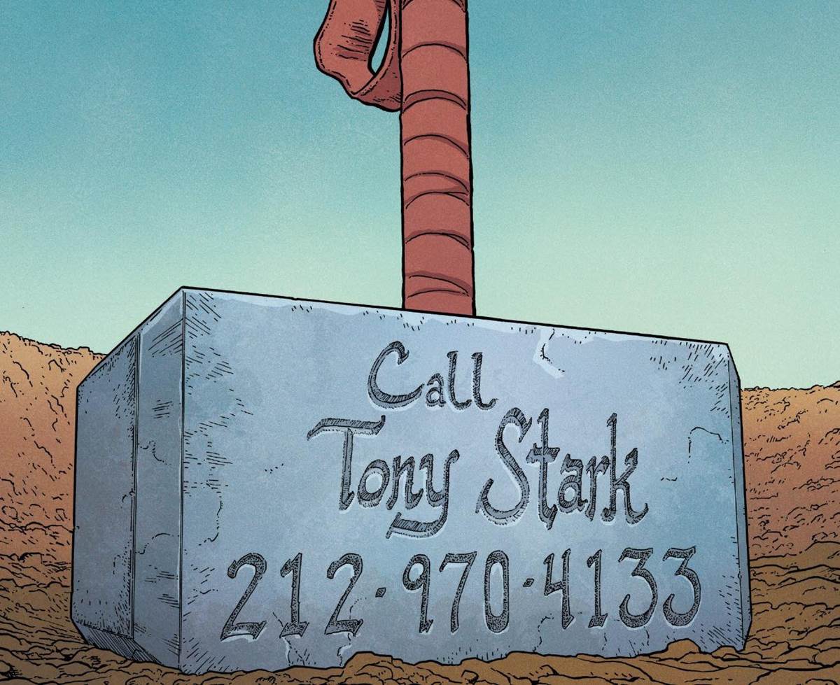 In Donny Cate’s “Thor #7,” the God of Thunder plays a little prank on Iron Man by writing the message “Call Tony Stark,” along with the superhero’s phone number on Mjolnir and sending it down to Broxton, Oklahoma. A local mechanic sees it crash down and doesn’t hesitate to give the Avenger a ring.