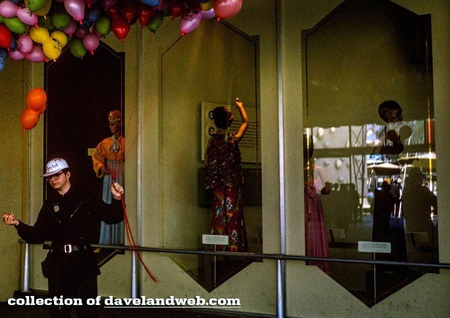 All in all, the attraction was pretty simple, basically a showcase of different outfits, but primarily focusing on replicas of gowns from famous people through the ages. As you can see in the picture, they had some mannequins with the dresses on to show them off in full regalia. But what really stands out to me in the picture is that someone was selling balloons in the exhibit. For all the talk that people say about how Disney has become too focused on milking every last cent out of their guests and how Walt would never do that, I think this photo, taken while Walt was alive, shows that that argument doesn’t hold up quite as strongly as many people would think.