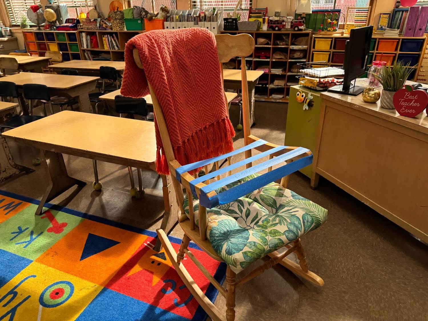 Barbara Howard’s rocking chair is an iconic piece of furniture in her classroom. The painter’s tape was just to make sure nobody sat in it. We all know Mrs. Howard is particular about her chair.