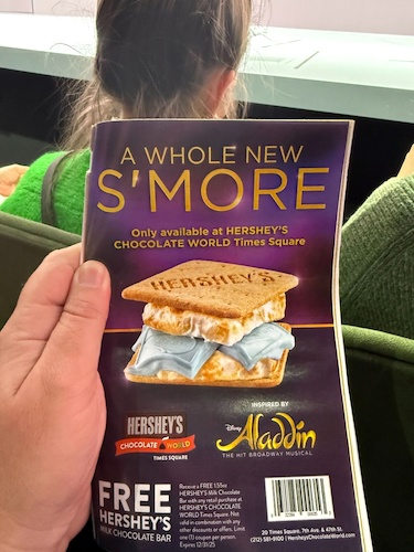 - In the playbill for the popular musical we found an ad for Hershey’s Chocolate World Times Square, which is currently offering “A Whole New S’More" inspired by Broadway’s Aladdin.