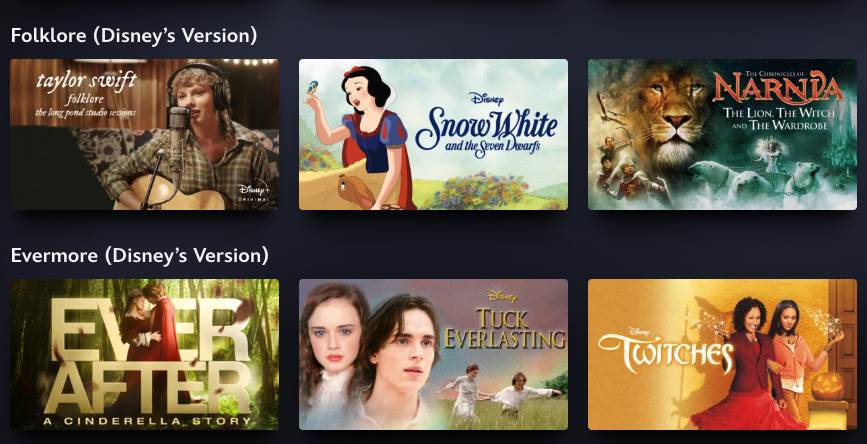 Another Taylor Swift feature, Folklore: The Long Pond Studio Sessions, leads off the category for that album, alongside other titles based on or inspired by folk tales, ranging from a number of Silly Symphony shorts to animated and live action versions of Snow White and the Seven Dwarfs and Beauty and the Beast.