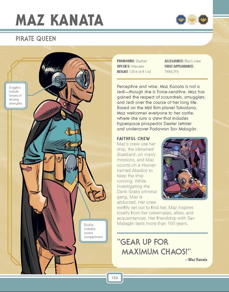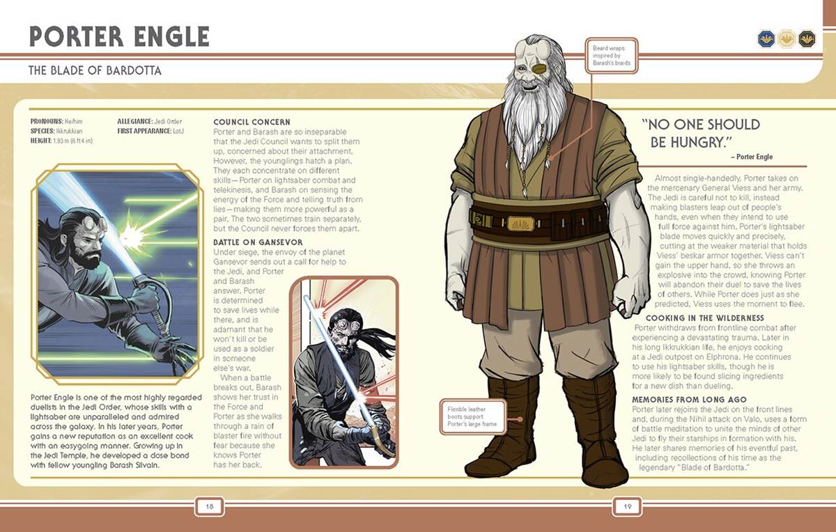 The book begins with a touching foreword by Star Wars: The High Republic Show host Krystina Arielle, and then moves on to an introduction that gives readers the basics of what The High Republic is all about. Then there’s a key walking us through how to use the reference book’s information– my one critique is that this could have been simplified a bit, but more on that later. We also get a timeline of the major events that occurred in Phases I and II, and then it’s right on to the main event– the many characters that occupy this storytelling initiative that has flourished for almost three years already. The major characters, like Porter Engle, for example, get a two-page spread, and at the top we’re given details like their pronouns, species, height, allegiance, and first appearance. Here’s where I started to scratch my head a little bit, because the “first appearances" are presented in abbreviated form, and I have to refer back to a chart in the early pages of the book to be reminded what they mean. Instead, the authors could have easily just written out the titles on any given character’s page (as you can see in the included sample pages, there’s plenty of room in that space).