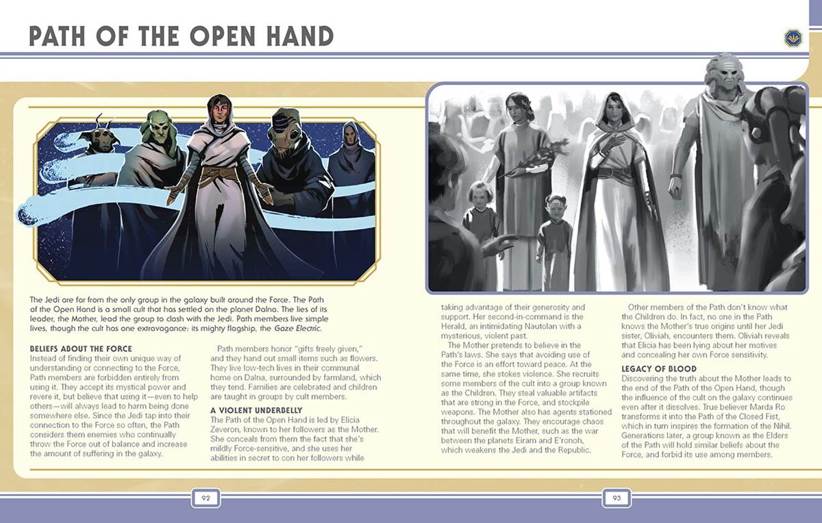 The other minor but still unnecessarily convoluted system of organization is the insignia on the top right of each entry that indicate in which Phase each character appears. These are represented by three insignia of ever-so-slightly different colors, instead of just… well, putting a Roman Numeral I, II, or III there. I think changing those confounding decisions on the editorial level would have improved the book by leaps and bounds, but otherwise I still enjoyed it quite a bit and already consider it invaluable as a resource, considering I spend a significant amount of my time combing through The High Republic content (the alphabetical index on the final page is also quite helpful for those purposes). As far as illustrations go, the book’s gorgeous cover art has been created by renowned painter (and former Disney animator) Phil Noto, while the interior artwork is drawn from a number of sources, including comic-book covers and interiors, concept art, video game screen-captures, and animation designs.