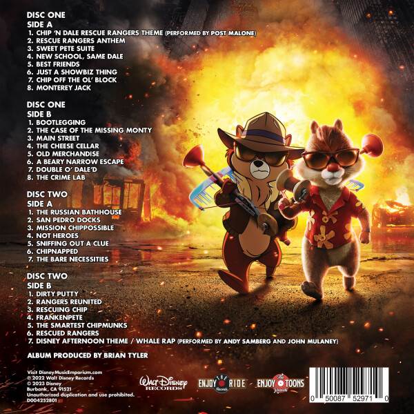 - Featuring the fantastic score by Brian Tyler, featuring "Chip 'n Dale Rescue Rangers Theme" Performed by Post Malone, and "Disney Afternoon Theme / Whale Rap Performed" by Andy Samberg, John Mulaney & Nathaniel Motte. Notably, the album is available on Chip N' Dale Stripe colored vinyl.