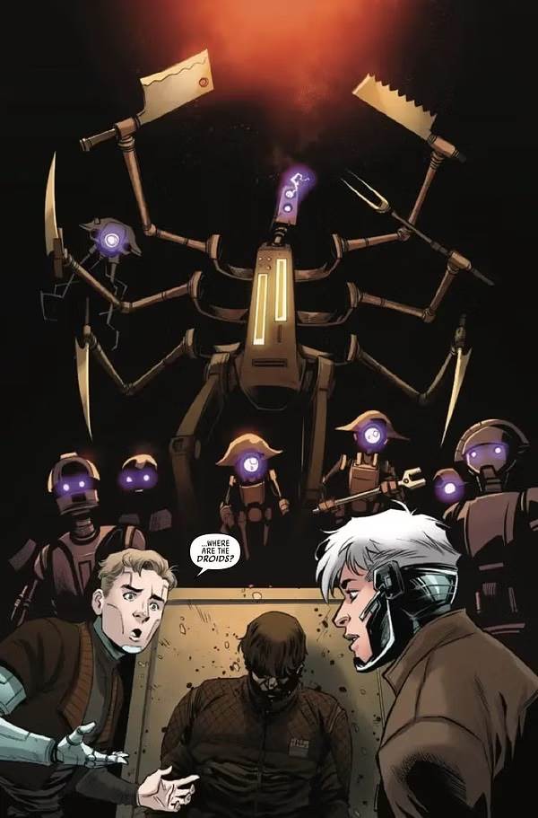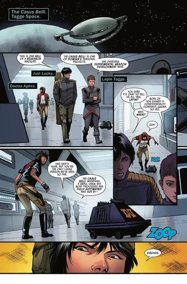 Doctor Aphra (2020) #37 begins with Imperial Officer turned Rebel Alliance Captain Magna Tolvan investigating a derelict rebellion ship with her ragtag crew. There, they find all the humans dead and are soon overrun with the ship’s murderous droids, all of whom have been infected with the virus-like consciousness of the evil artificial intelligence known as the Scourge. Meanwhile, on the Tagge Corporation research station Casus Belli, rogue archaeologist Dr. Chelli Lona Aphra and her colleague assassin Just Lucky are received by Lapin Tagge after their mission to Havel Prime. Of course, that planet isn’t the only place in the galaxy being overtaken by the Scourge virus, as Chelli and Lucky quickly discover.
