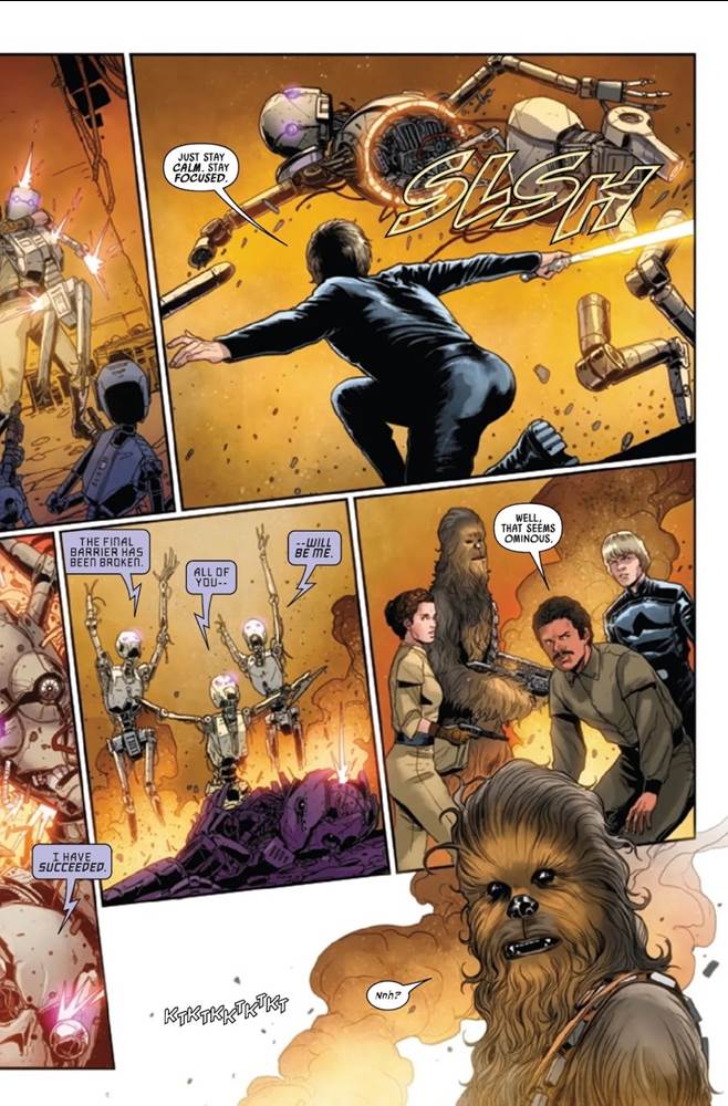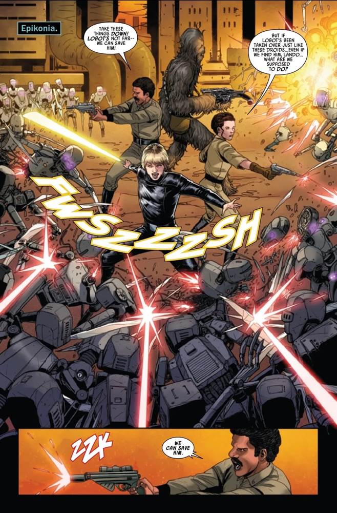 I want to start off this review by saying that I woke up this morning to an Instagram post by writer Charles Soule warning fans not to read this issue until after the release of Star Wars: Dark Droids #5, which doesn’t come out until the last week of December. But in the interest of doing my job I did read it and I will review it, though as per Mr. Soule’s wishes I will make my best effort to avoid the broader spoilers as to the outcome of the Dark Droids saga. That said, Star Wars (2020) #41 begins on the planet Epikonia, where Luke Skywalker, Lando Calrissian, Princess Leia, and Chewbacca are battle swarms of droids possessed by the evil artificial intelligence known as the Scourge. Their goal is to rescue Lando’s loyal cyborg friend Lobot, who was recently taken over by the Scourge himself, and how they get out of this particular mess is what I’m going to avoid spoiling here– suffice it to say that I’ll have more thoughts once December 27th rolls around.