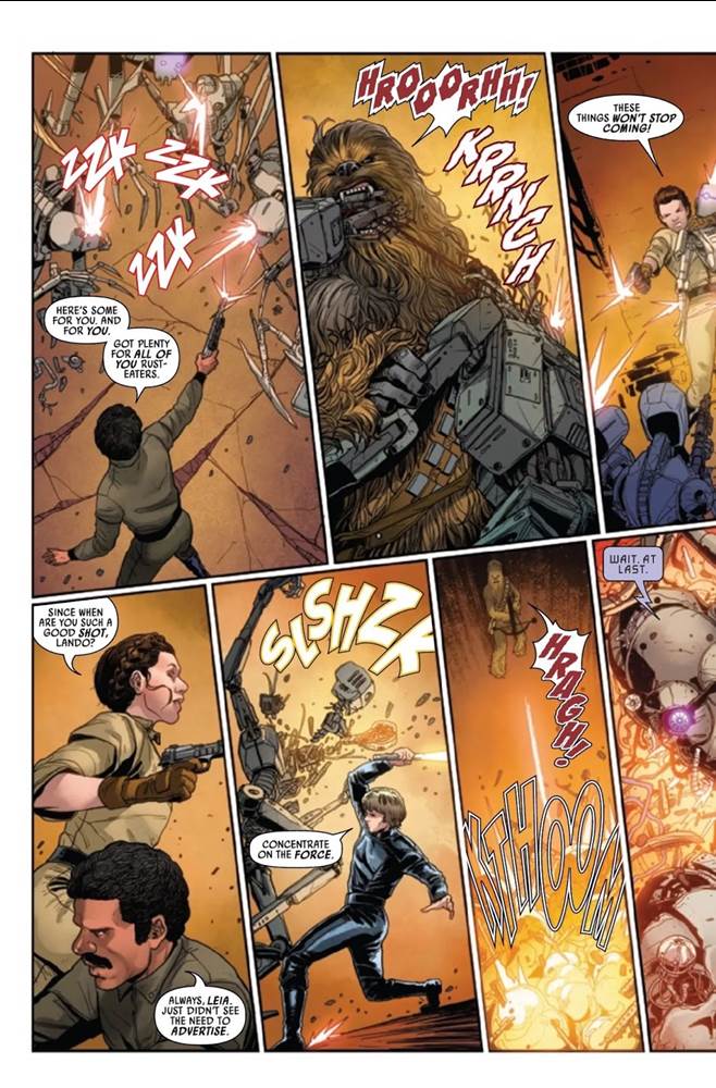 But get out of it they do, and the next step is to get Lobot back aboard the Millennium Falcon. In the meantime, Luke and Leia decide to stay behind on Epikonia to help the Scourge survivors, while Chewie helps Lando carry his pal to the ship. There, Lando warns the Wookiee that what he’s about to see will be damaging to Calrissian’s reputation among the Rebel Alliance, and then he reveals the stolen ancient “Talky" droid hidden in one of the Falcon’s compartments. Lando demands that the Talky repair Lobot’s cybernetic implants under the threat of an eternity of the droid equivalent of pain. That’s when Leia and Luke walk in, having discovered that there wasn’t much they could do to help on the planet– and, as good people, being concerned about Lobot. And this is where the Talky uses fairly impenetrable logic to deduce that Lando must confess his crimes against the Rebellion to Luke and Leia before the droid will be willing to save Lobot’s life.