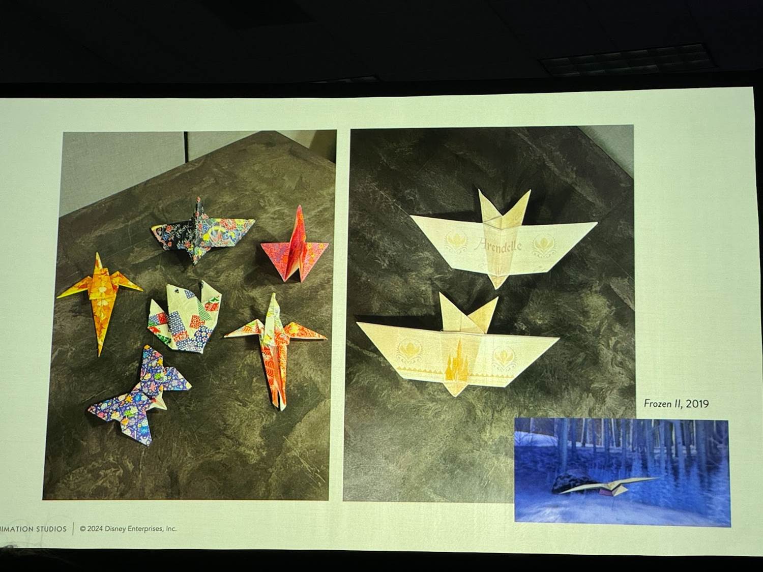 Some reference materials don’t fit into the category of a maquette or a manmade model. For example, these origami shapes were made by artists during a brainstorming session to design a message bird that Anna sends to Elsa at the end of Frozen 2. The ARL houses all of the attempts, including the final design.