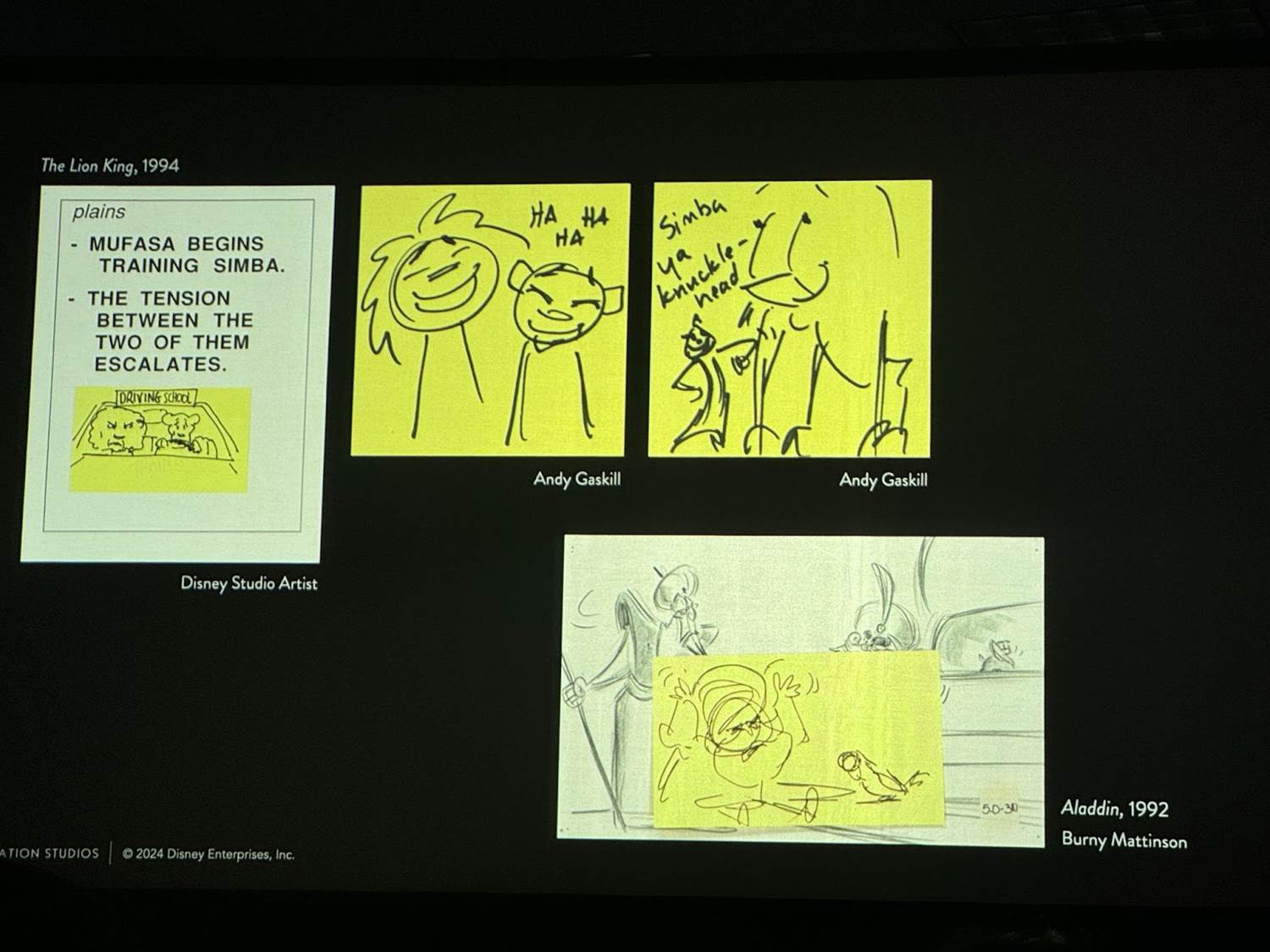 Post-Its came to prominence in the 1980s, and despite the adhesives on the back, which some archives remove for preservation, the ARL has decided to keep them as-is. Part of the reason is that there are many examples of Post-Its being used to make adjustments to a story sketch. An example was shown of one such correction during the production of Aladdin.