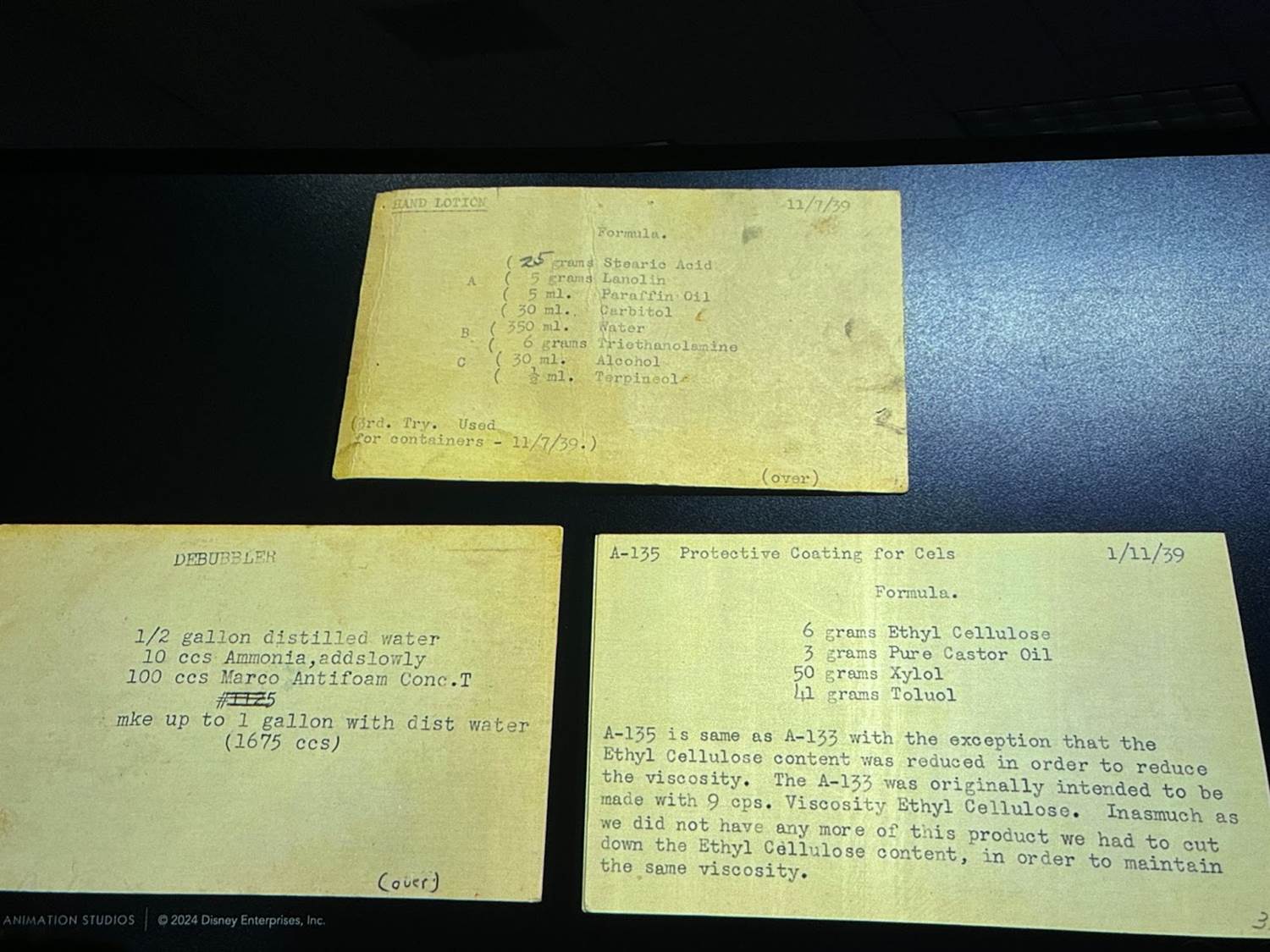 Walt Disney Animation Studios began making its own paint early in the advent of Technicolor, and the ARL has numerous index cards with recipes for custom colors created for various productions. They even have recipes for “debubbler" (it reduces the bubbling of paint on celluloid) and a hand lotion for painters to heal their skin after handling so many chemicals.