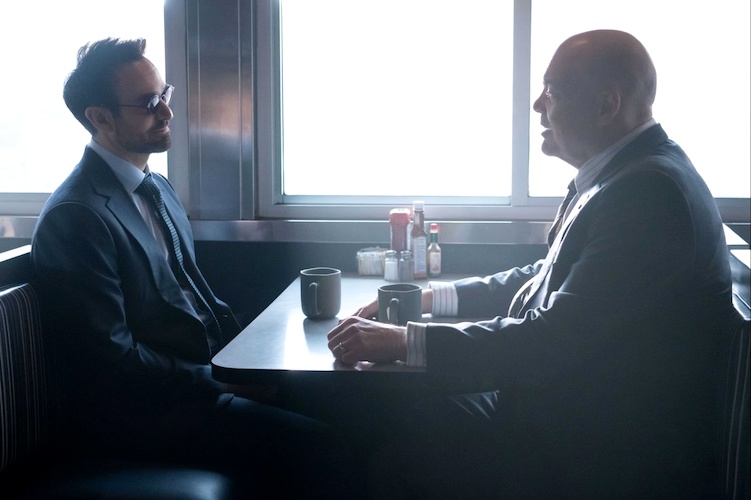 In a diner, Matt and Fisk sit at a table and reminisce. They both admit they don’t make it to Hell’s Kitchen much these days. Fisk tells Matt he had nothing to do with Foggy’s death, referencing a promise that he has kept. That promise would be that Fisk cannot tell anyone about Matt’s secret identity or hurt Foggy or Karen, or Matt would expose Vanessa as the criminal that she is. Eventually their conversation gets to be a bit hostile and Matt tells Fisk if he steps out of line, he will be there. Fisk tries to goat Matt a bit, referencing his attempt to kill Bullseye. He tells Matt he will not tolerate vigilantes in his city and warns him there will be consequences if Daredevil returns.