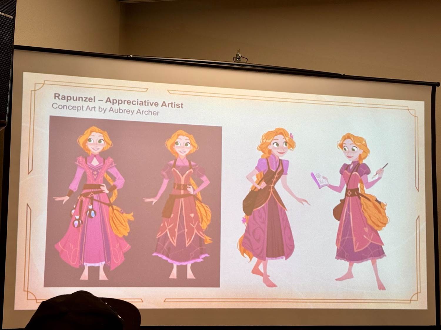 Aubrey Archer explored Sapphire’s intellectual and curious qualities in Rapunzel - Appreciative Artist (from Ursula’s Return). This design shows Rapunzel sketching in a magical forest, emphasizing her inquisitiveness. Sapphire’s shape language of repeating, geometric forms is present in Rapunzel’s dress and the forest’s succulents and flowers, giving her a structured yet organic look that mirrors her personality. Aubrey showcased the evolution of the concept during the event. A close composition captures Rapunzel’s focus on the natural world, while her long hair adds movement and frames the scene.