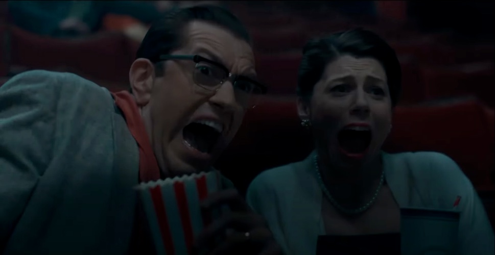 While we saw this in the previous teaser, it's worth including once again, as we get an impressive shot of Mr. Ring-a-Ding appearing to claw his way out of a movie theater screen as two patrons react in terror.