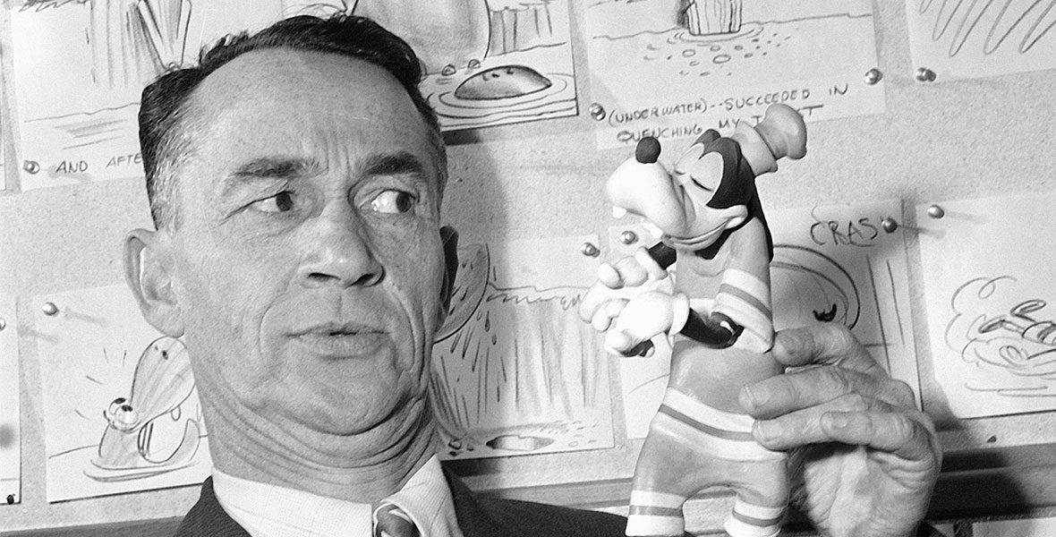 In part homage and part jest, Colvig adopted and embellished those mannerisms to use as a vaudeville stage character, “Oregon Appleknocker." At the Disney Studios, he performed this impersonation for Walt, who was intrigued by the idea. Eager to expand his cast of animated characters beyond Mickey Mouse, Walt decided to develop a new character based on the “Oregon Appleknocker." The next day, Colvig Pinto went in front of a microphone and camera and again performed his vaudeville character, while Disney animator Tom Palmer sketched out a character based on his performance.
