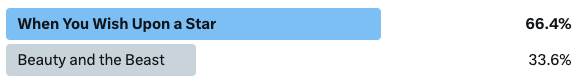 Before we move on to our next matchup, let’s take a look at our last result. For the first time in two years, Beauty and the Beast has lost a poll. “When You Wish Upon a Star" will be moving on to the next round to challenge “A Whole New World" for a spot in the Final 4.