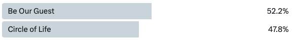 Before we move on to our next matchup, let’s take a look at our last result. “Be Our Guest" survived a very close matchup against “Circle of Life," which almost delivered a big upset in our very first matchup.